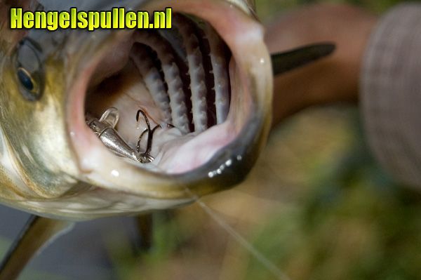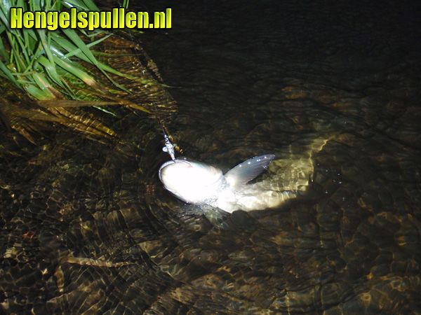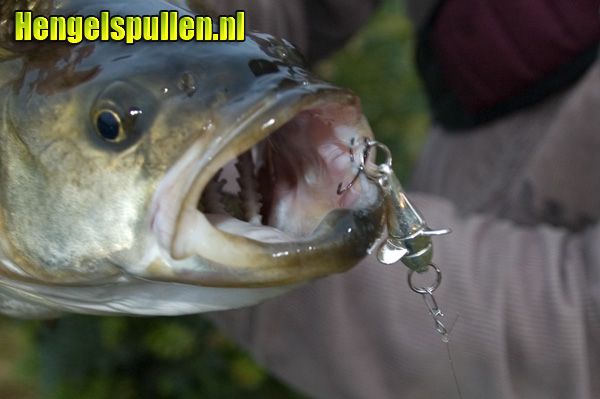 Het was een woensdag in juli en de wekker ging vroeg. Om 2.45 in de ochtend stond ik onder de douche. Ik had namelijk om 5.00 bij Willem afgesproken in Ommen dus ik moest flink het gaspedaal indrukken om op tijd aan te komen. We gingen weer achter de roofblei aan. Ik had mijn huiswerk goed gedaan en een aantal kunstaasjes geregeld waarvan ik hoge verwachtingen had. Welke ik zou kiezen, zou ik op de plaats van bestemming bepalen. Na een voorspoedige reis kwam ik aan bij Willem en na het nuttigen van een kopje koffie gingen we op pad. Aangekomen op de hotspot besloot ik voor de Devon te kiezen. Het dingetje was klein, zilver en er zat een propeller op. Precies wat in de sterk stromende rivier een visje op zou moeten leveren. Dat het de goede keus was, bleek al bij de eerste worp. Een roofblei klapte letterlijk met veel kabaal op het ijzeren ding. "Hij doet het!" riep ik tegen Willem, die enigsinds verontwaardigd naar mijn kromme hengel zat te kijken. De uren die volgden, bleef ik maar vis vangen. De ene na de andere roofblei knalde op de Devon propeller. Werpen is met dit ijzeren ding overigens ook een waar genoegen. Je kan heerlijk precies werpen doordat de wind weinig grip op het propellertje heeft.