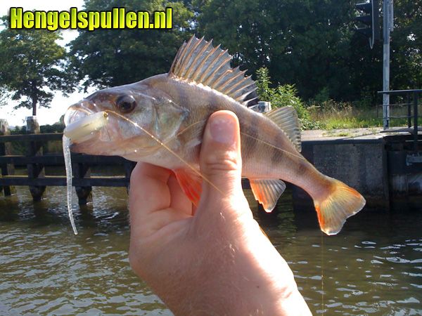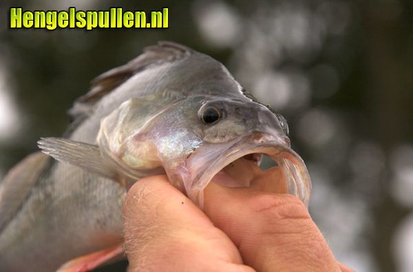 Ook snoekbaars, hier een baby exemplaar, is perfect op de dropshot te vangen